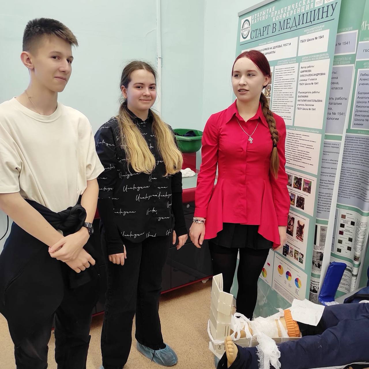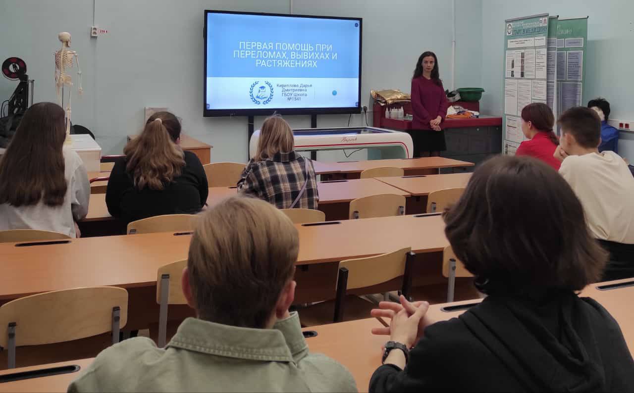 На занятии наши исследователи узнали о различных видах переломов и научились алгоритму оказания первой помощи, особенно при открытых переломах с кровотечениями.