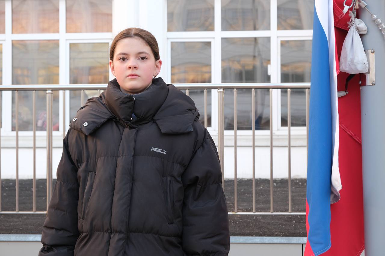 Право поднять Государственный флаг Российской Федерации на этой неделе представилось ученице 6 «А» Мирославе и ученику 8 «Е» Илье.