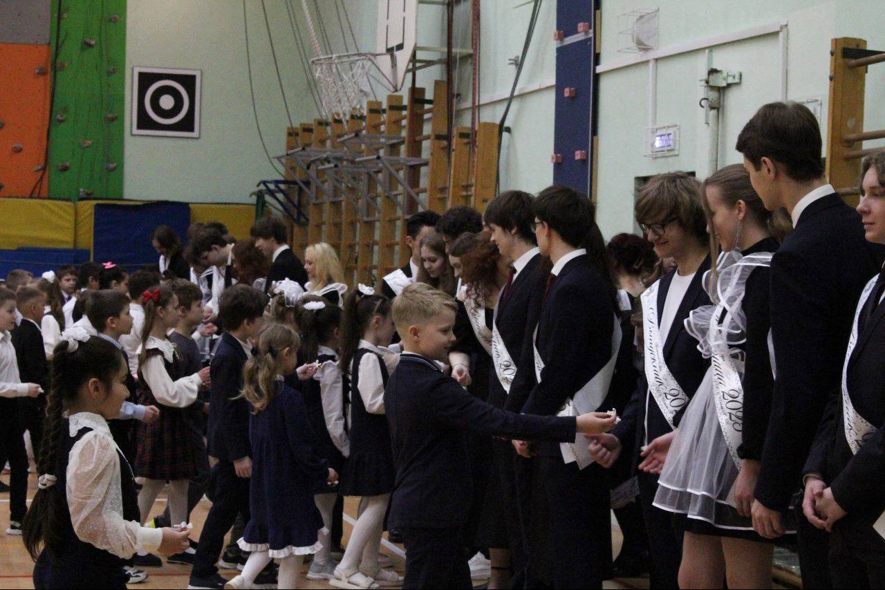 По доброй традиции выпускники передали эстафету первоклассникам, вручив им памятные подарки, а малыши, в свою очередь, повязали старшеклассникам ленточки выпускника.